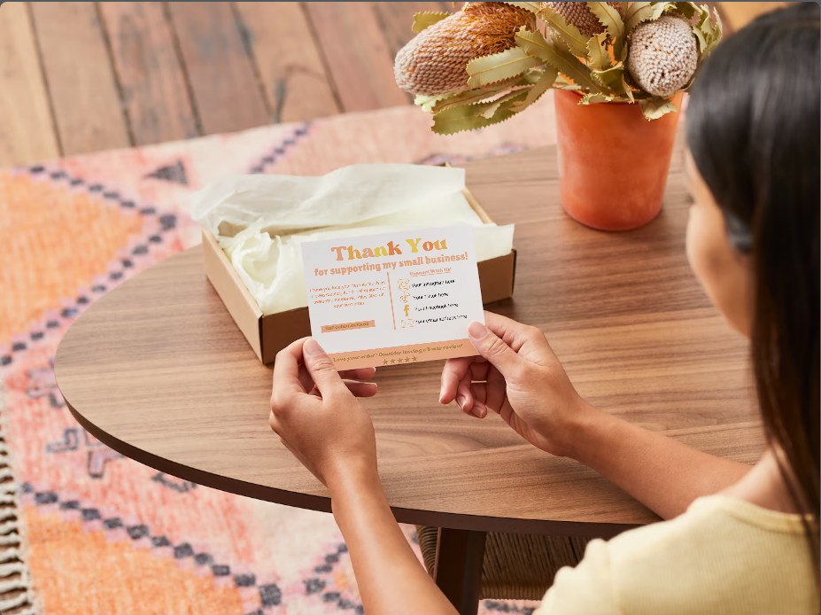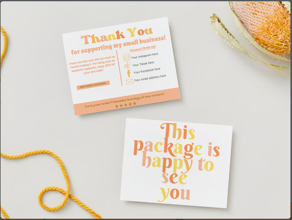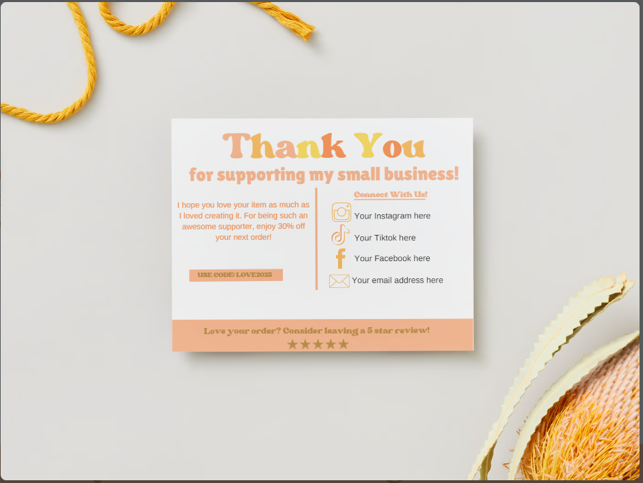 Our easy to customize thank you card template is the perfect way to show your appreciation and encourage repeat business. Add a personal touch by including a discount for their next purchase.